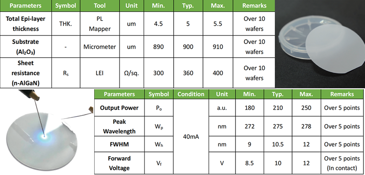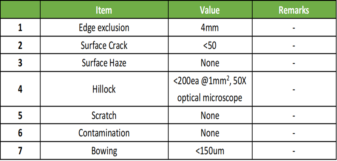 We offer wafer sizes of 2-inch, 4-inch, and 6-inch sizes. The thin film crystals are of excellent quality, with X-ray rocking curves of AIN (002) and (102) planes on sapphire substrates as low as 60 arcsec and 200 arcsec at half maximum. Custom specifications are also accepted.