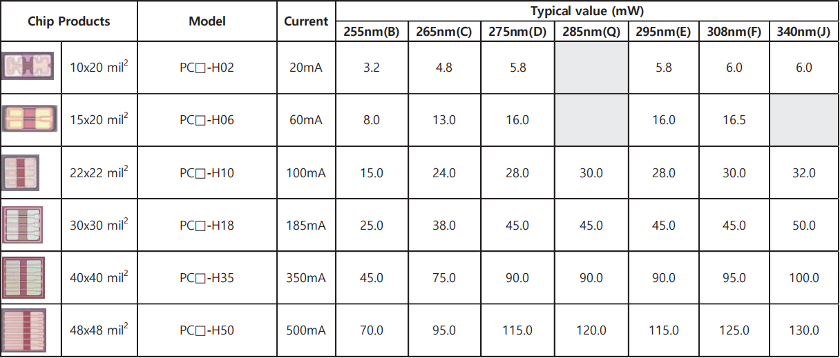 We offer a wide selection of chips in various sizes, optimized for light output efficiency (10mil, 15mil, 20mil, 22mil, 30mil, 40mil, 45mil, and 48mil). We continuously improve WPE (Wavelength Percentage Efficiency) every quarter. To date, the highest WPE is 6.4% (275nm, 350mA, 130mW, 5.8V). These highly durable chips can withstand harsh environments (85°C, 85°C humidity).