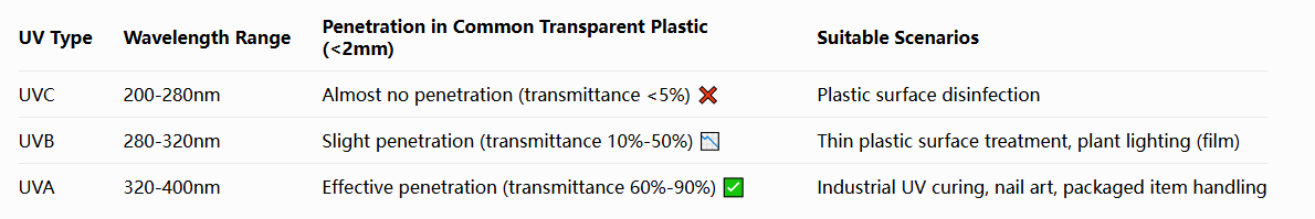 Conclusion: While UVB can penetrate thin, transparent plastics, its penetration is weak, making it suitable only for treating shallow surfaces (such as plastic surface coatings or small items contained within thin plastic packaging) ✅.
